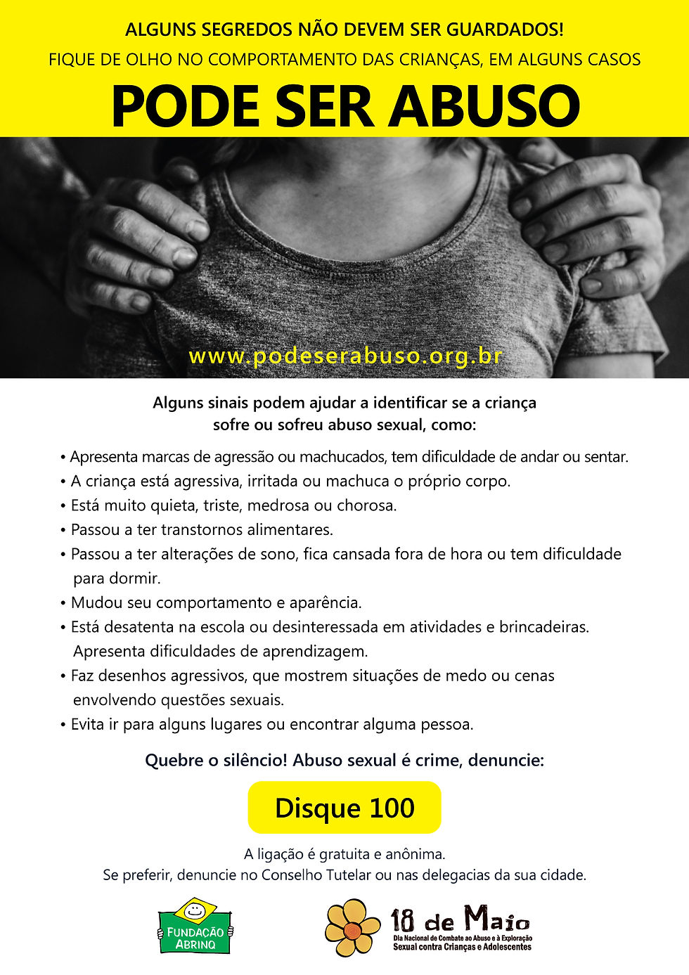 A Fundação Abrinq lançou a campanha #PodeSerAbuso com intuito de mobilizar a população para quebrar o silêncio, e orientar sobre possíveis sinais de que uma criança está sofrendo abuso e informam os canais de denúncia.